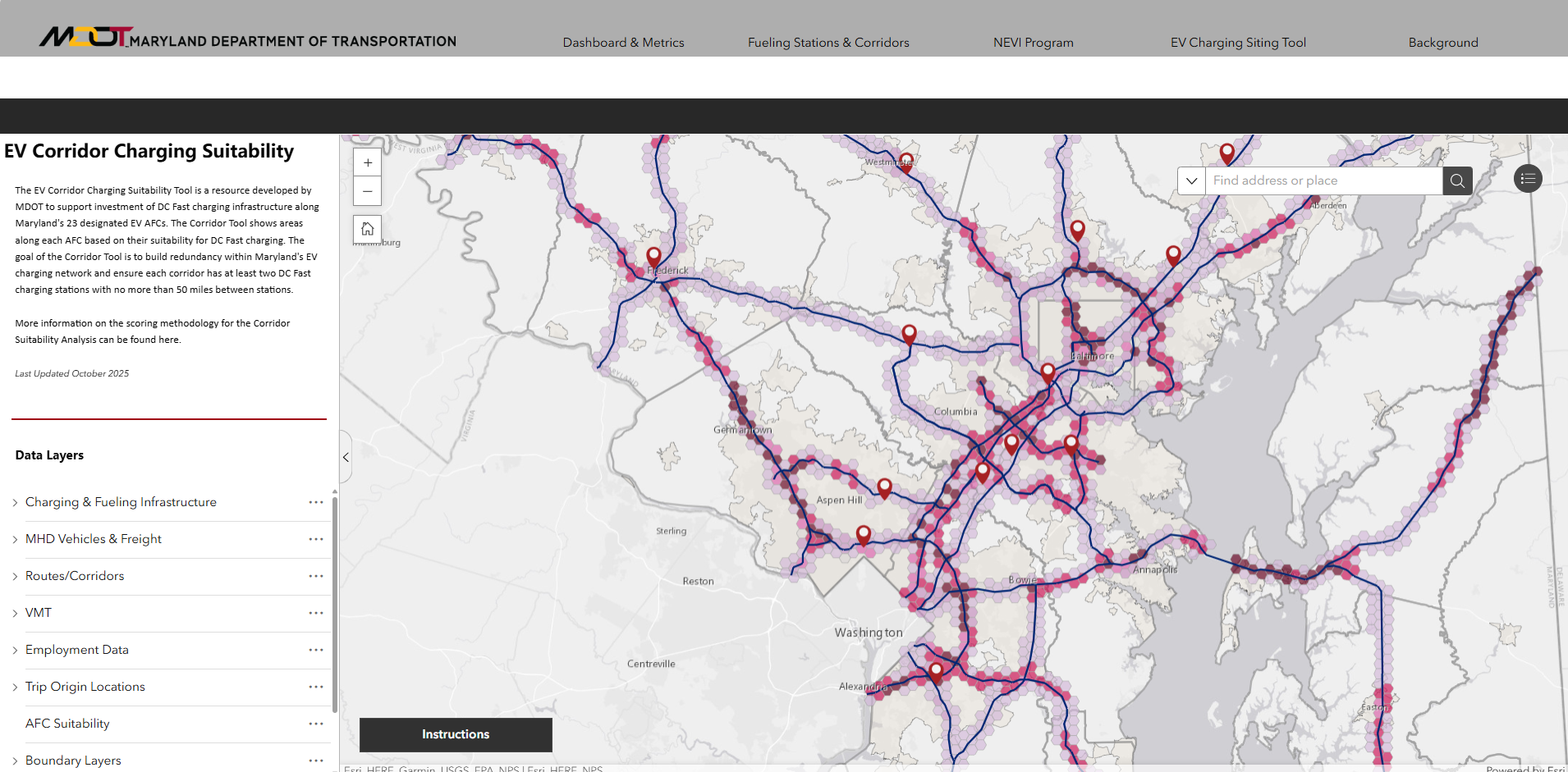 The EV Corridor Charging Suitability Tool supports the investment of Direct Current (DC) Fast charging infrastructure along Maryland’s 23 designated EV Alternative Fuel Corridors (AFCs) in order to build redundancy within Maryland’s EV charging network.